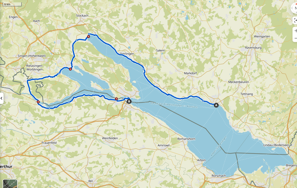 Am 02.09.2023 war es endlich so weit. Die Hitzewelle mit 35 Grad und mehr war vorbei, die Tage mit unendlichen Regengüssen ebenfalls, und Anfang September versprach das Wetter wieder eine angenehme Tour. Nachdem ich bereits vor ein paar Wochen den östlichen Teil des Bodensees umrundet habe, stand heute der westliche Teil auf dem Programm. Von Romanshorn nahm ich die Fähre nach Friedrichshafen, wo es losging, um etwa 110 km via Überlingen, Radolfzell und Stein am Rhein nach Konstanz zu fahren.