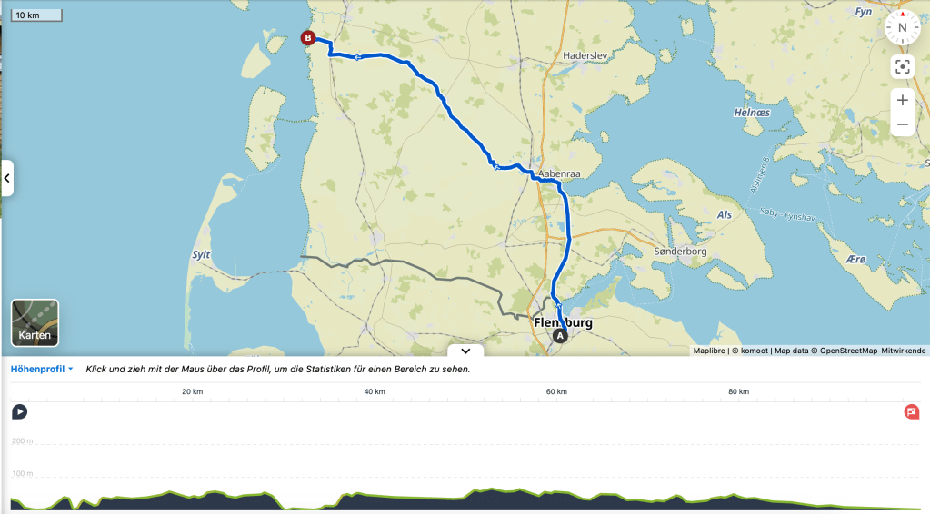 Die ersten Etappen sind vollbracht. Am Freitag Abend ging es (zunächst per Auto mit Gepäck und Fahrrad als Ladung) nach Flensburg auf einen Comapingplatz, und dann ging’s los. Hier die Strecken: