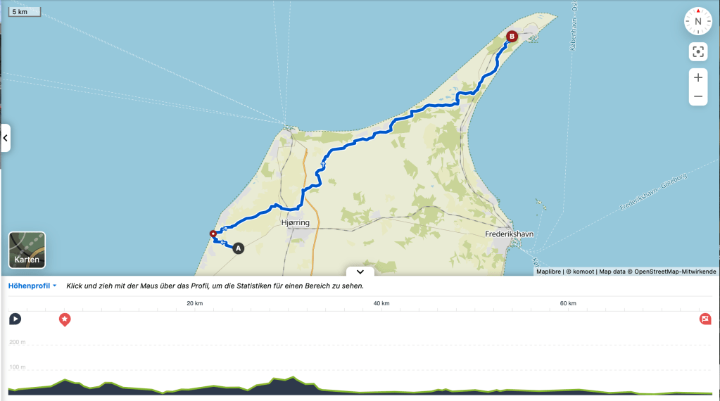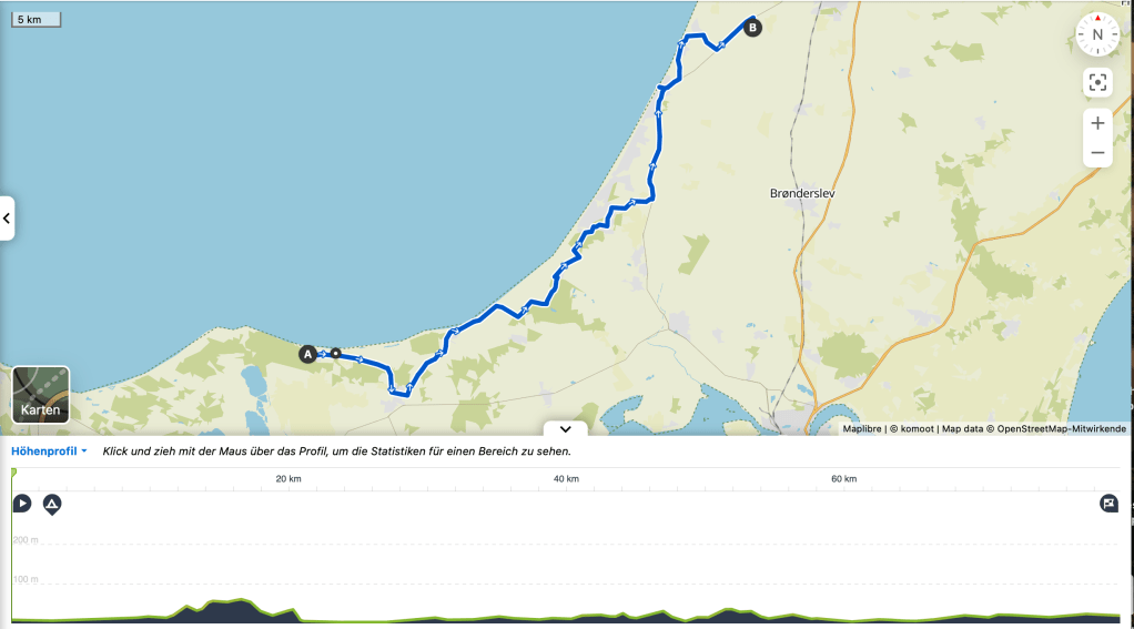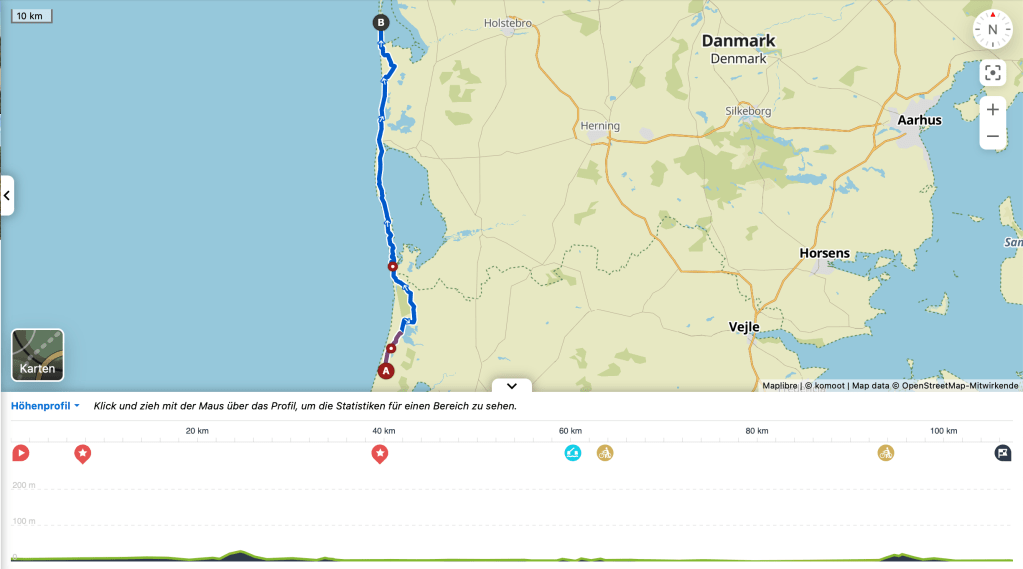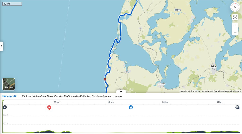 23.05.2023, in Vejers/Stjerne hat es morgens geregnet und gestürmt. Keine sonnigen Aussichten für den Tag. Denn heute steht eine 100+ km Tour an: