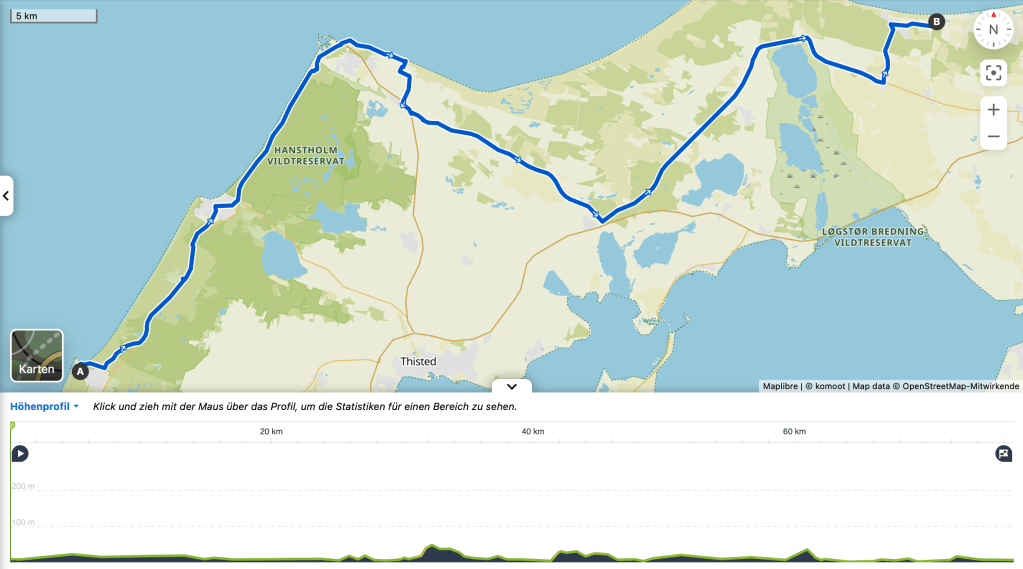 Von Klim ging’s weitestgehend an der Küste entlang. Ein besonderes Ziel hatte ich mir nicht gesetzt, sind doch in der Gegend, in die ich komme, zahlreiche Shelter und notfalls auch Campingplätze. Ich habe mir dann einen schön im Wald gelegenen Shelter ausgesucht, doch leider waren alle Hütten von anderen Radreisenden und Wanderern belegt. Zum Zelt aufbauen hatte ich wenig Lust, so bin ich ein paar km weiter gefahren und habe dort ein Shelter gefunden, was sogar noch besser war. Geräumig, mit Wasser- und Stromanschluss (den ich aber nicht brauchte, weil alle meine Powerbanks noch voll waren und der Fahrrad-Akku war noch zu 90% voll, da ich fast nur mit ausgeschalteter Unterstützung gefahren bin) und das Beste: verschliessbar, so dass man nicht nur seine Ruhe hatte, sondern auch völlig windgeschützt lag.