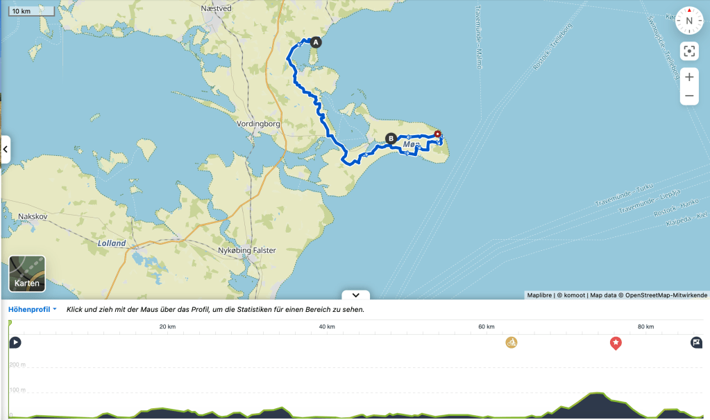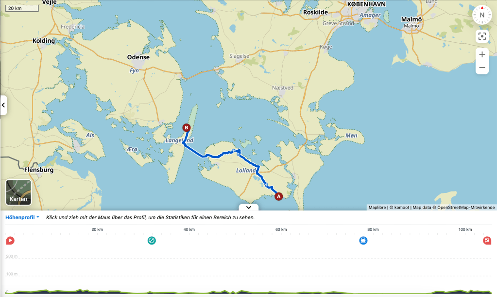 Das waren drei anstrengende Etappen! Am ersten Tag, von Kopenhagen nach Praesto, war es sehr warm, richtig schwül. Da ich nicht wusste, ob und wo ich für die Nacht unterkomme, und ob es da Strom zum Laden meines E-Bike Akkus gibt, bin ich nahezu 100km im Bio-Bike Modus, d.h. mit ausgeschaltetem Motor gefahren. Abends war ich entsprechend geschafft.